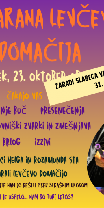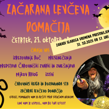 Obveščamo vas, da je dogodek »Začarana Levčeva domačija«, ki je bil prvotno načrtovan za ta četrtek, zaradi slabe vremenske napovedi prestavljen.