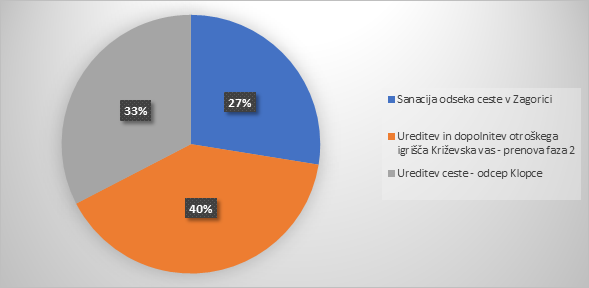 Vrednost umeščenih projektov iz VO Beričevo-Brinje je skupaj 20.000 EUR, vrednost umeščenih predlogov iz VO Dolsko pa skupaj 13.800 EUR.