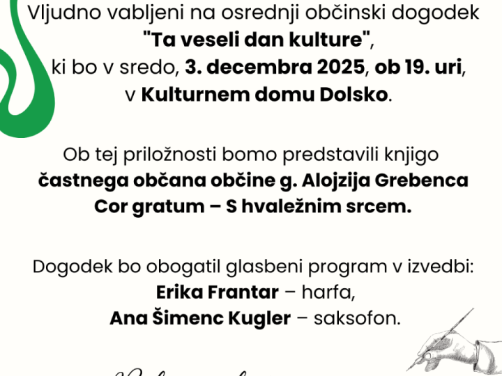 Vabljeni na osrednji občinski dogodek TA VESELI DAN KULTURE na katerem bomo predstavili knjigo "COR GRATUM, S hvaležnim srcem" častnega občana občine, g. Alojzija Grebenca.