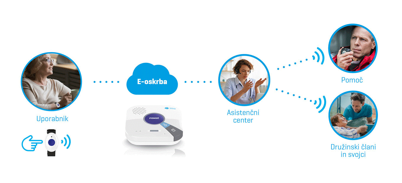 Uporabnik E-oskrbe lahko asistenčni center na pomoč pokliče 24 ur na dan in vse dni v letu, in sicer s preprostim pritiskom na gumb varovalnega telefona, ki je nameščen v njegovem domu, ali s pritiskom na gumb za klic na pomoč na zapestnici, ki jo ima vedno pri sebi. Poleg zapestnice uporabnik prejme tudi mobilni detektor gibanja na obesku, ki ima prav tako poseben gumb za proženje klica na pomoč, hkrati pa detektor tudi samodejno zazna padec in ob tem sproži klic v asistenčni center. Uporaba opreme je zelo enostavna. Uporabniki bodo z naročilom storitve brezplačno prejeli: