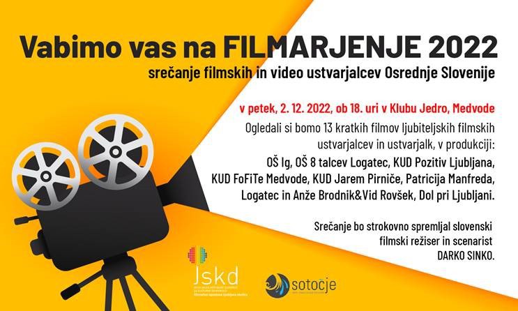 Vabimo vas na Filmarjenje 2022, srečanje filmskih in video ustvarjalcev Osrednje Slovenije v petek, 2. 12. 2022, ob 18. uri, v Klubu JEDRO, Medvode.