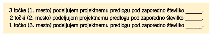 Navodila za glasovanje so naslednja (zapisana so tudi na glasovnici): iz seznama predlaganih projektov, ki je naveden na glasovnici, glasujte za 3 predloge projektov tako, da na črto vpišete zaporedno številko projektnega predloga, ki mu podeljujete 3 točke (po vašem mnenju najboljši predlog), 2 točki (po vašem mnenju drugi najboljši predlog) in 1 točko (po vašem mnenju tretji najboljši predlog).