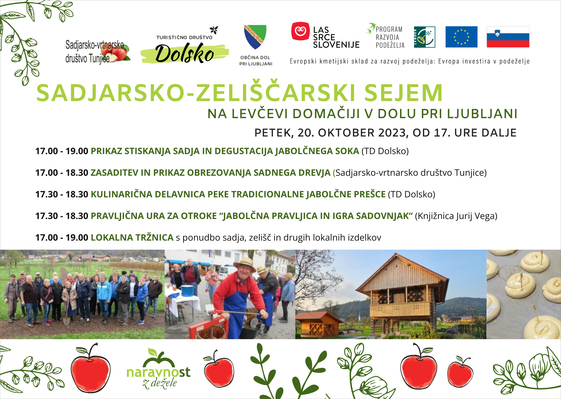 v petek, 20. oktobra 2023, od 17. ure dalje bo na Levčevi domačiji (pri občinski stavbi, Dol pri Ljubljani 18) potekal Sadjarsko-zeliščarski sejem.