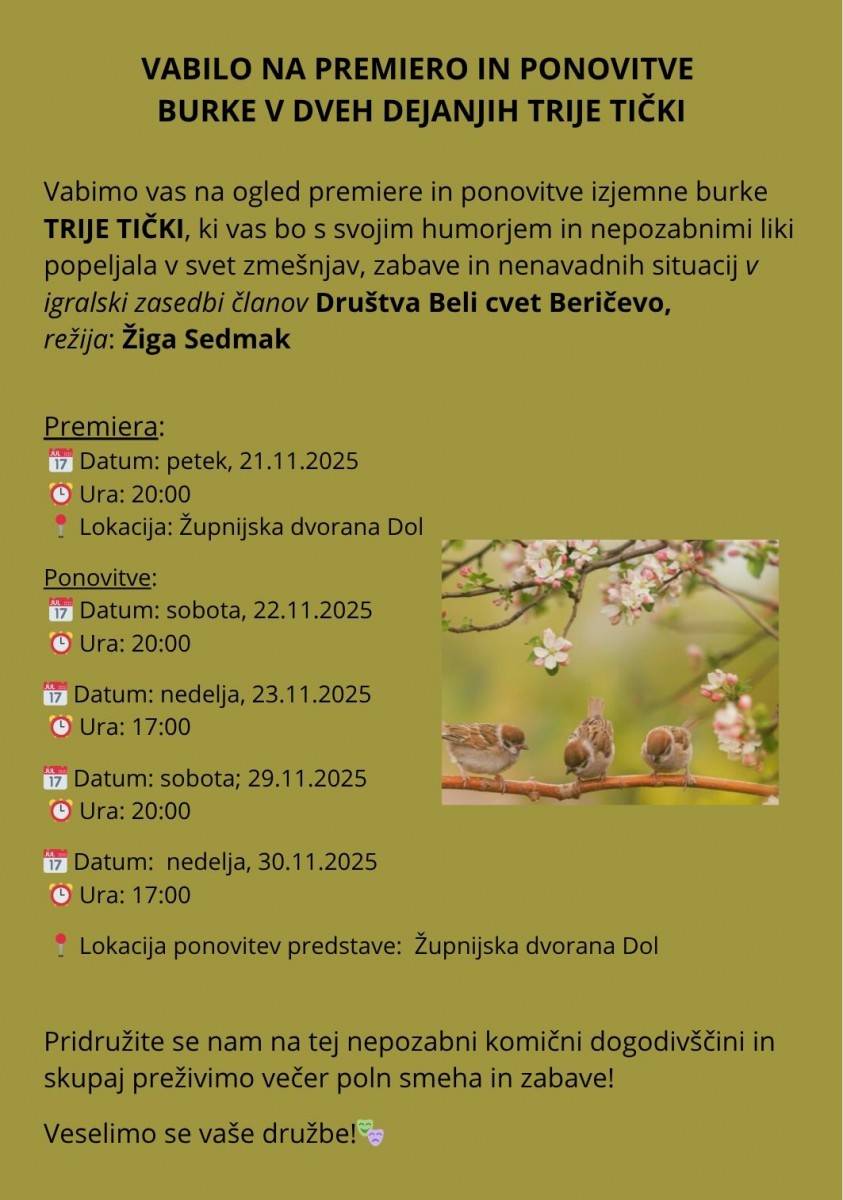 Vabimo vas na ogled gledališke predstave, ki vas bo s svojim humorjem in nepozabnimi liki popeljala v svet zmešnjave, zabave in nenavadnih situacij.