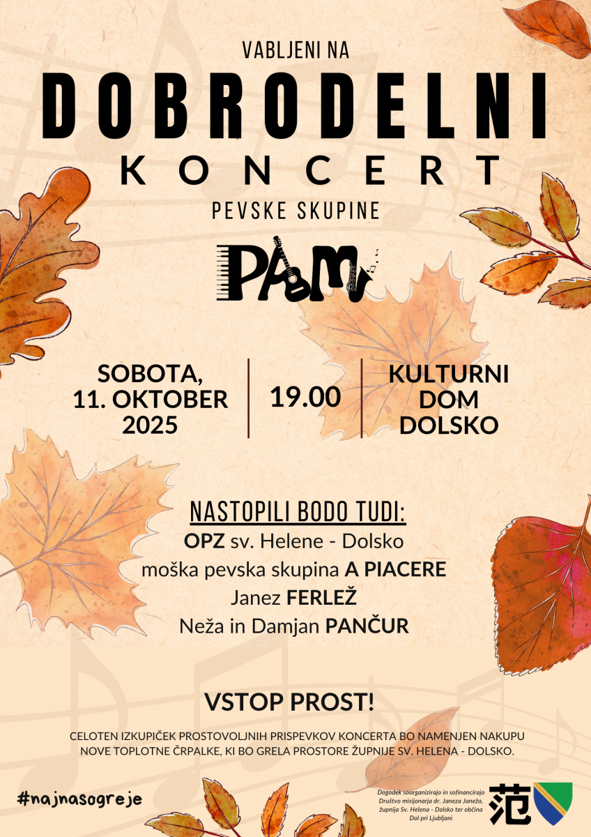 celoten izkupiček prostovoljnih priospevkov koncerta bo namenjen nakupu nove toplotne črpalke, ki bo grela prostore župnije sv. Helene - Dolsko.