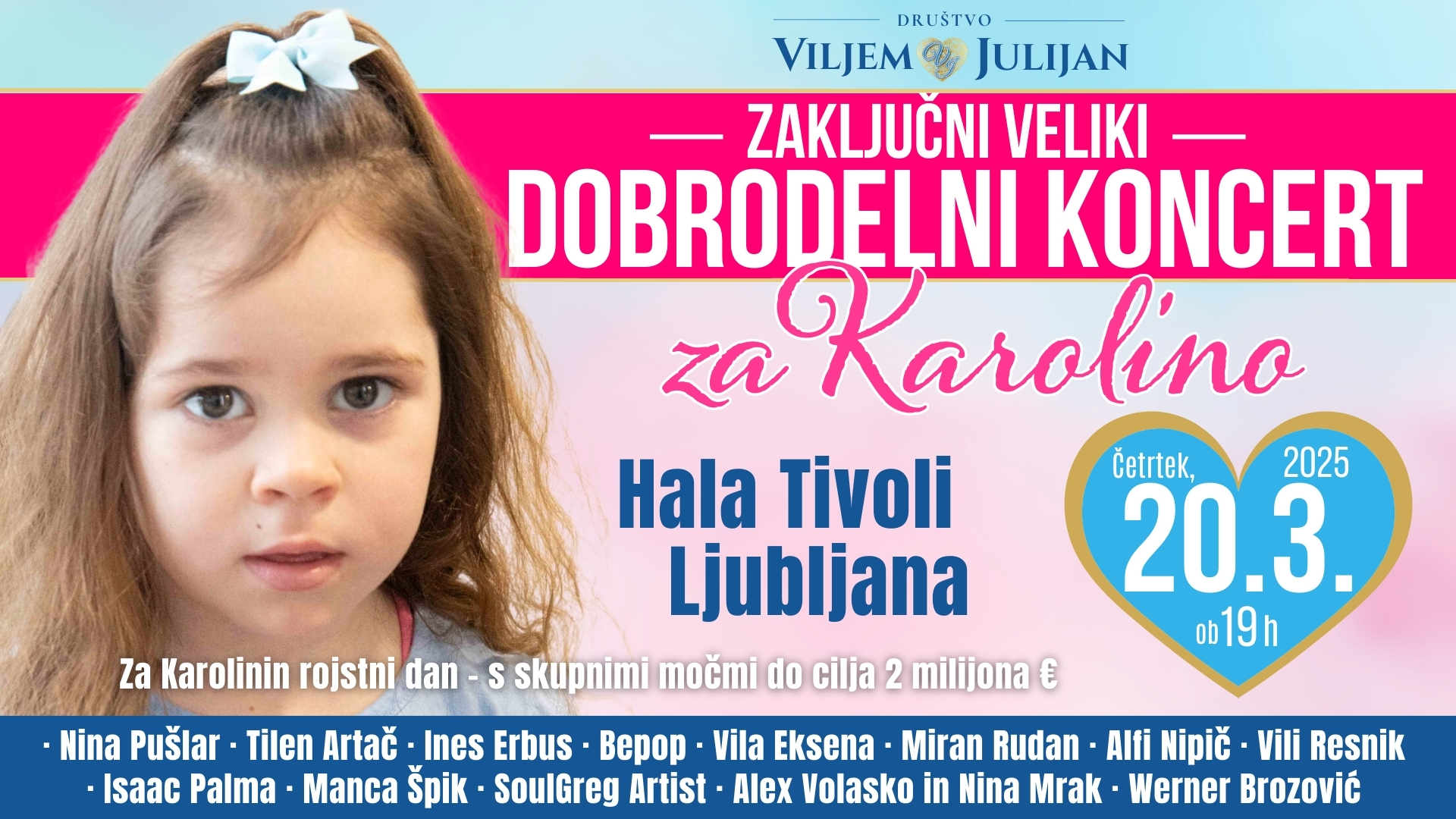Deklica Karolina, ki ima smrtonosno redko bolezen, bo konec februarja praznovala svoj rojstni dan in ob tem v Društvu Viljem Julijan 20.3. zanjo organizirajo zaključni veliki dobrodelni koncert, s katerim bodo zbirali še zadnjih 65.000€, ki so potrebna za razvoj genskega zdravljenja, ključnega za njeno življenje. »To bo tudi koncert najglobje zahvale vsej Sloveniji, ki je z največjim srcem pristopila k zbiranju sredstev za našo malo borko, obenem pa bo dogodek tudi darilo za Karolino ob njenem rojstnem dnevu,« pravi dr. Nejc Jelen, predsednik Društva Viljem Julijan.